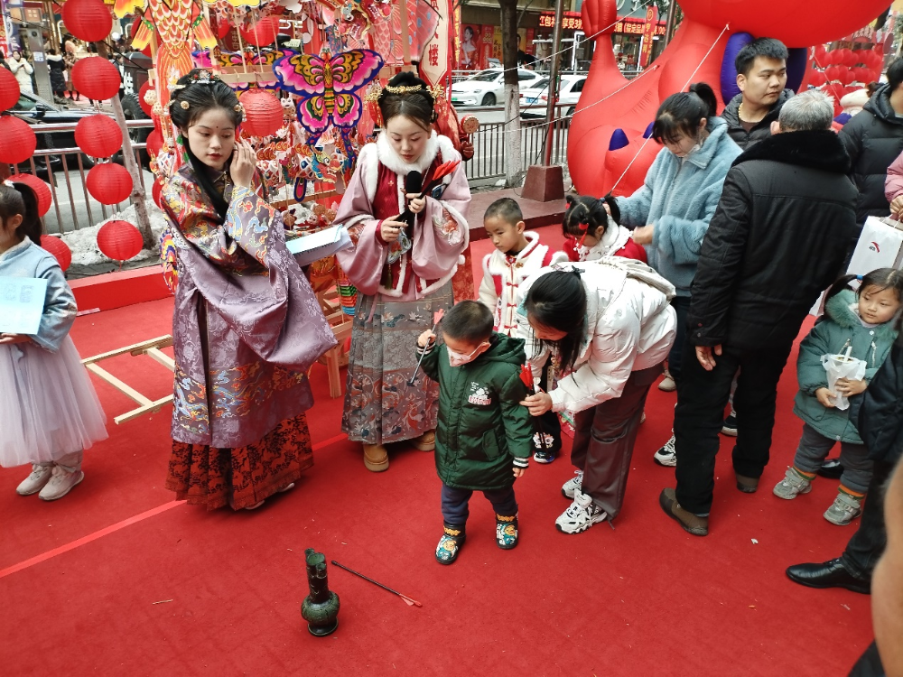 在百货大楼门前的非遗摊位,热气腾腾的糖画香气四溢,幸福、甜美的年味儿扑面而来,泥人、草编、虎头鞋等非遗摊位前也都围满了路人。“对诗有奖品了!”卖货郎这挤满了许多孩童,他们争相答题或参与投壶游戏来赢取奖品。“感觉今年特别有年味,特意带孩子过来看看。”杨女士表示,在这里不仅能吃喝玩乐,还能参与趣味游戏,年味十足!