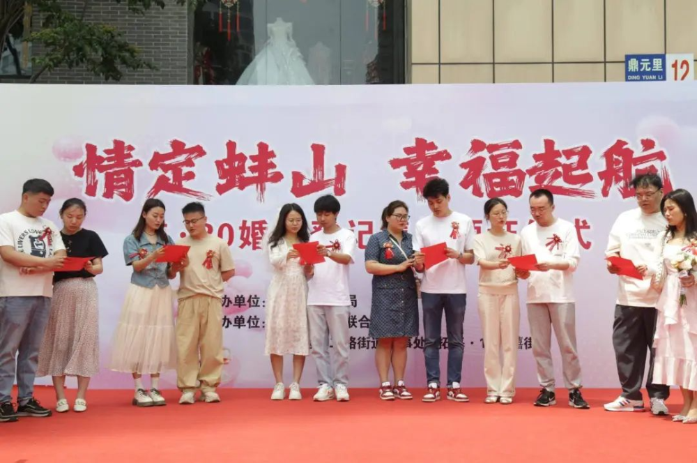 5月20日上午,阳光明媚,寓意着爱情与幸福的日子里,一场别开生面的“情定蚌山、幸福启航”5·20婚姻登记集体颁证仪式在蚌山区隆重举行。本次活动由蚌山区民政局主办,蚌山区妇女联合会、蚌山区纬二路街道以及拓基·1919囍街联合协办。