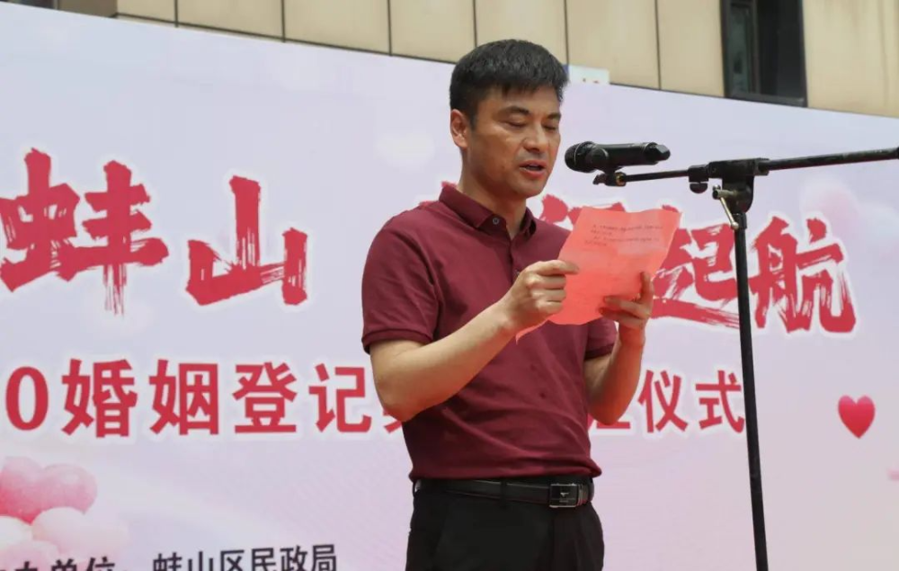 在颁发证书之后,邵兵副区长发表了热情洋溢的致辞。他代表蚌山区政府对新人们表示热烈的祝贺,并希望他们能够在今后的生活中相互扶持、共同成长,为构建和谐社会贡献自己的力量。