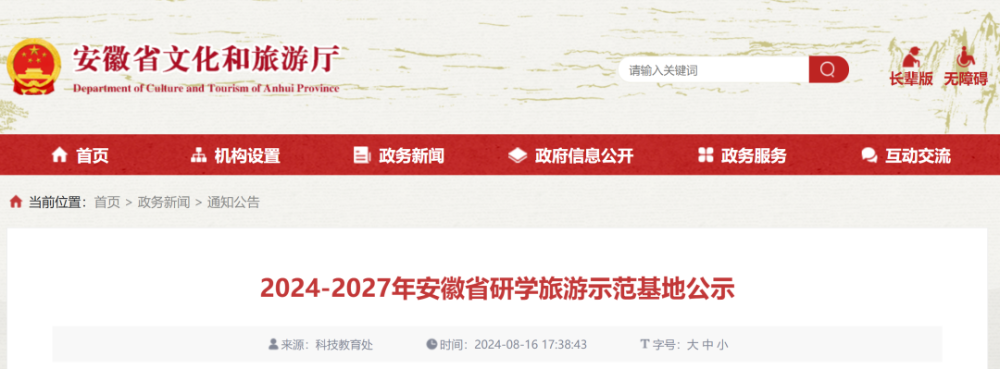 根据安徽省文化和旅游厅《关于开展2024年安徽省研学旅游示范基地申报认定工作的通知》要求,经单位申报、各市文化和旅游局初审推荐,省文化和旅游厅组织专家进行省级评审和抽查复核,拟对安徽博物院(安徽省文物鉴定站)等103家新申报基地、安徽青松研学科普实践教育基地等26家申请复核基地认定为“2024-2027年安徽省研学旅游示范基地”,现进行公示。