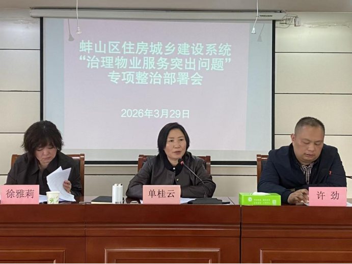 为深入贯彻落实全市住房城乡建设系统“治理物业服务突出问题”专项整治工作要求,切实解决辖区物业服务领域群众急难愁盼问题,3月29日下午,蚌山区住房城乡建设系统“治理物业服务突出问题”专项整治部署会在淮河社区中心5楼会议室召开,会期半天。区政府副区长单桂云出席会议,区纪委监委、区市场监管局、区住建交通局分管负责人,区物业办负责人,各乡街(社区中心)分管负责人、城管科科长,区物业协会会长、副会长、秘书长及各物业企业负责人参会,会议由蚌山区住建局物业分管负责人徐雅莉主持。