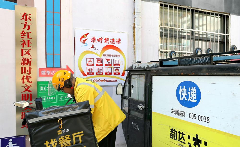 淮畔新港湾内配备了饮水机、微波炉、冰箱、医药箱、多功能电源插座、工具箱、无线网络、报刊书籍、充气工具等物品,服务内容广且能满足户外劳动者的需求,让他们切实感受到党组织的温暖,为新兴领域行业发展注入红色基因,实现了服务居民群众“零距离”。