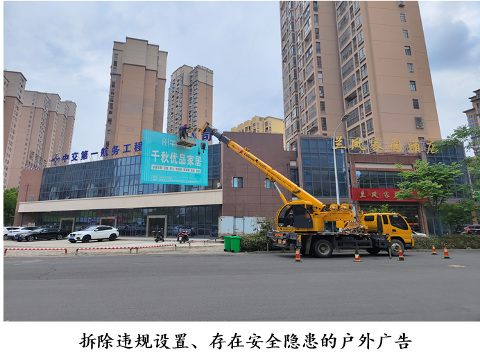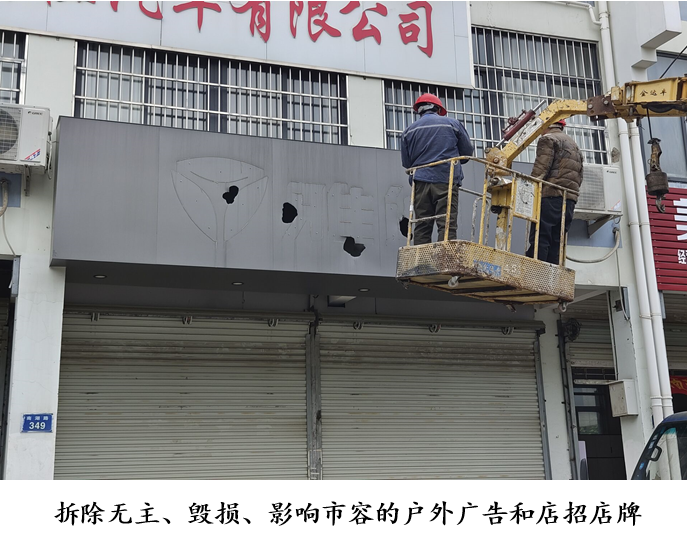 自4月下旬起组织了针对违规设置、破损严重户外广告和店招店牌的专项拆除行动。经过执法人员前期走访摸排,发现部分无主的店招因年久失修、破损严重,存在严重安全隐患,还有少数违规设置的户外广告影响市容市貌。经过大量细致的准备工作,在征得房主和设置方同意后,区城市管理局组织人员和大型专用设备,对违规设置和破损严重的店招广告进行集中拆除,目前第一阶段的整治任务已顺利完成,拆除各类违规、毁损店招广告15处,面积约200平方米。