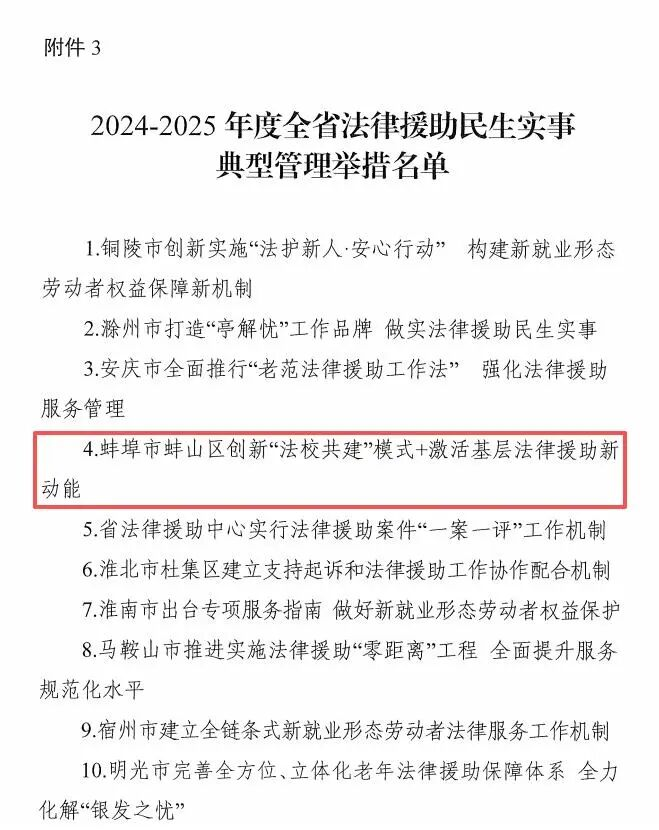 近日,安徽省司法厅办公室印发《关于2024-2025年度全省法律援助民生实事优秀案例和典型管理举措评选结果的通报》,蚌埠市蚌山区创新“法校共建”模式,成功入选全省法律援助民生实事典型管理举措名单,成为全省10项典型管理举措之一。