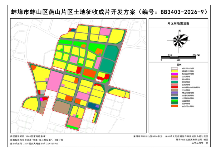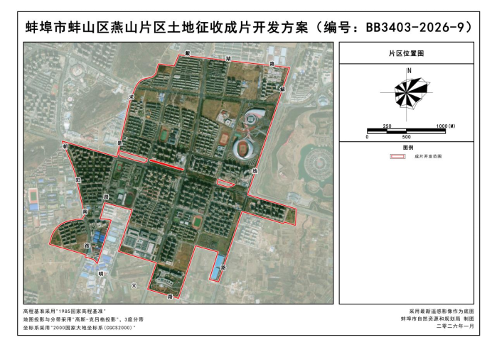 根据《中华人民共和国土地管理法》第四十五条规定,按照《自然资源部关于印发<土地征收成片开发的通知>》(自然资规〔2023〕7号)以及《安徽省土地征收成片开发标准实施细则》(皖自然资规〔2021〕4号)规定,蚌埠市人民政府组织编制了《蚌埠市蚌山区燕山片区土地征收成片开发方案》(编号:BB3403-2026-9),现对方案主要内容进行公示,征求成片开发范围内农村集体组织、村民及社会公众意见。在公示期间,对该方案有意见或建议请在公示期内以书面等法定形式向蚌埠市蚌山区人民政府反馈。