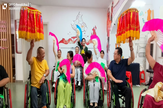 训练中,队员们克服身体不便,为打磨一个扇花姿势反复练习,即便臀部磨出茧子也毫无怨言。云端赛场上,他们伴着欢快旋律默契配合,轮椅的平稳移动与扇绢的灵动翻飞相映成趣,既展现了非遗魅力,更传递出自强不息的精神力量。