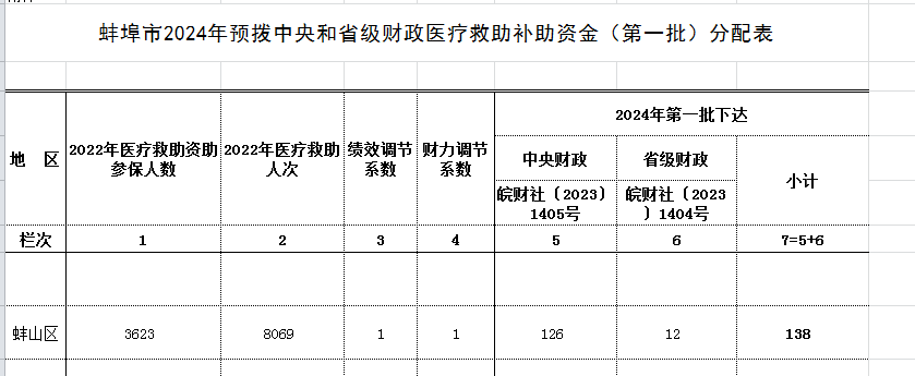 附件:蚌埠市2024年预拨中央和省级财政医疗救助补助资金(第一批)分配表