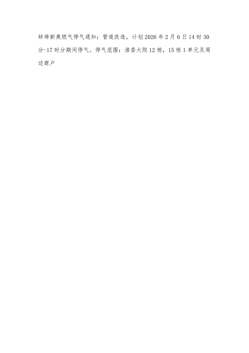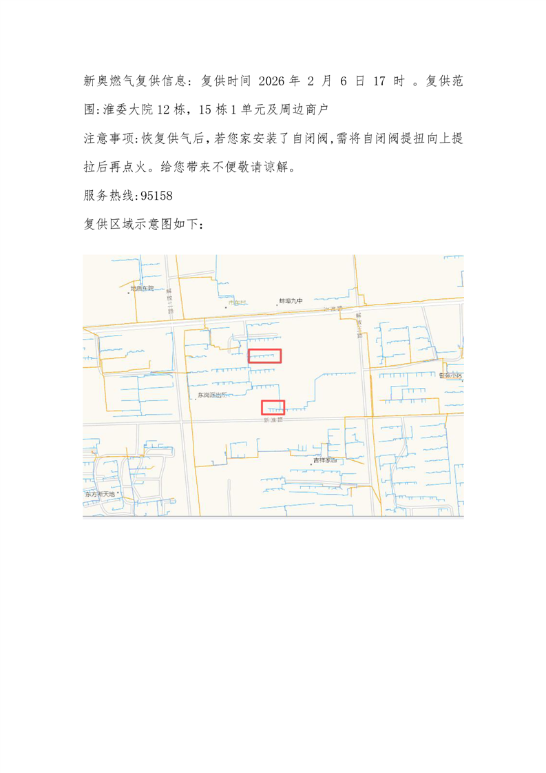 新奥燃气复供信息 复供时间 2026年 2 月 6 日 17 时 。复供范围 :淮委大院12栋,15栋1单元及周边商户