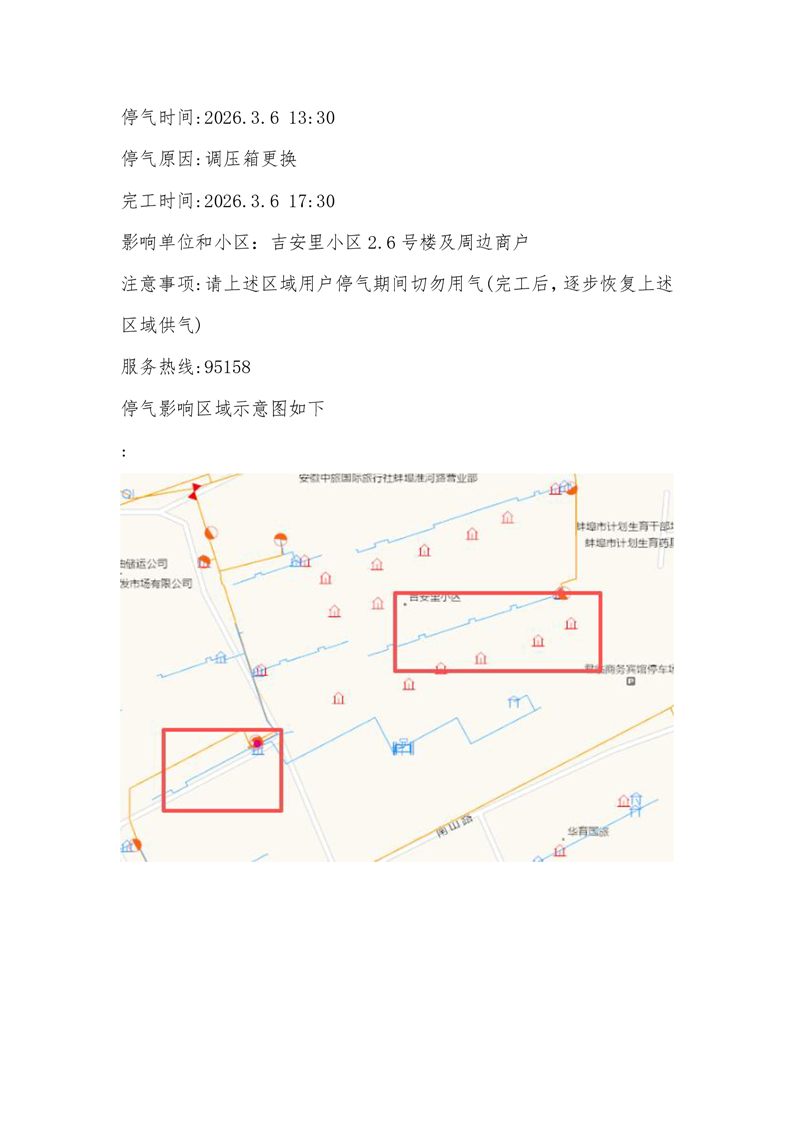 蚌埠新奥燃气停气通知:因调压箱更换,计划2026年3月6日13时30分-17时30分期间停气。停气范围:吉安里小区2.6号楼及周边商户。