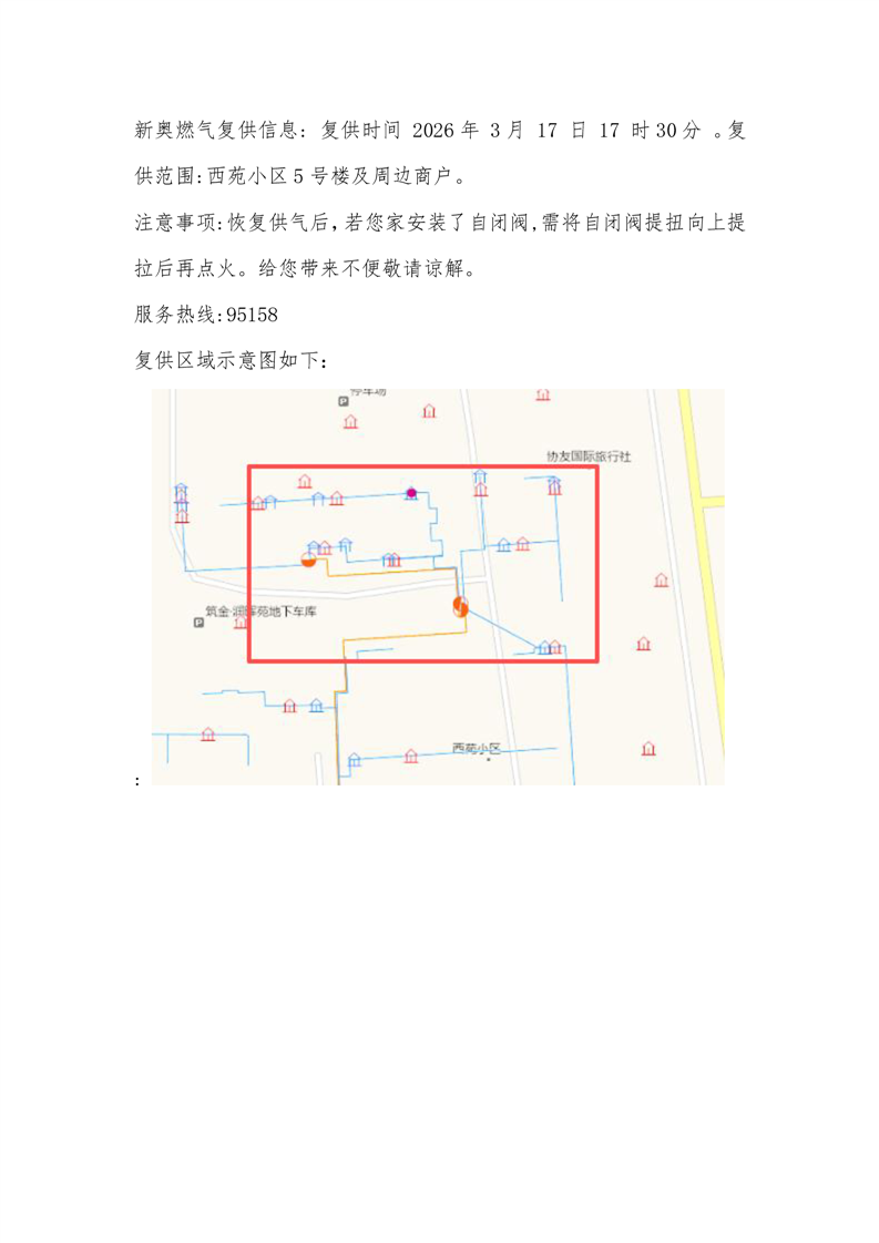 新奥燃气复供信息 复供时间 2026年 3月 17 日 17 时30分 。复供范围:西苑小区5号楼及周边商户。