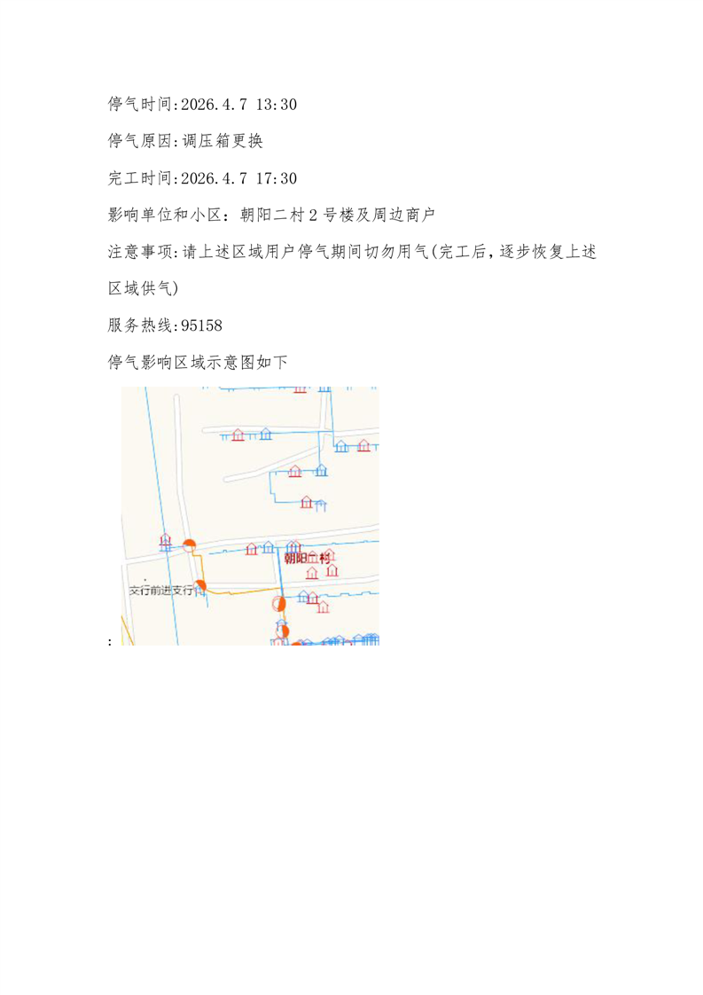 蚌埠新奥燃气停气通知:因调压箱更换,计划2026年4月7日13时30分-17时30分期间停气。停气范围:朝阳二村2号楼及周边商户。
