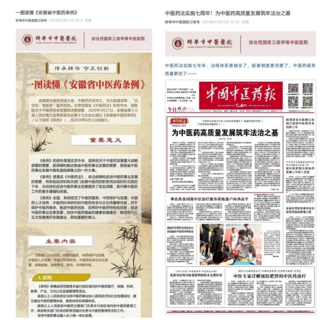 2024年7月1日是《中华人民共和国中医药法》实施七周年纪念日,今年也是《安徽省中医药条例》实施四周年。市中医医院通过在微信公众号推送相关知识科普,重点解读中医药法立法亮点和重大制度创新以及保护、扶持和促进中医药事业发展的精神实质,并在门诊大厅LED大屏滚动播放“一法一条例”宣传标语,不断扩大宣传覆盖面,全方位、多角度科普《中华人民共和国中医药法》与《安徽省中医药条例》相关知识,增强更多群众的中医药文化参与感、获得感和认同感。